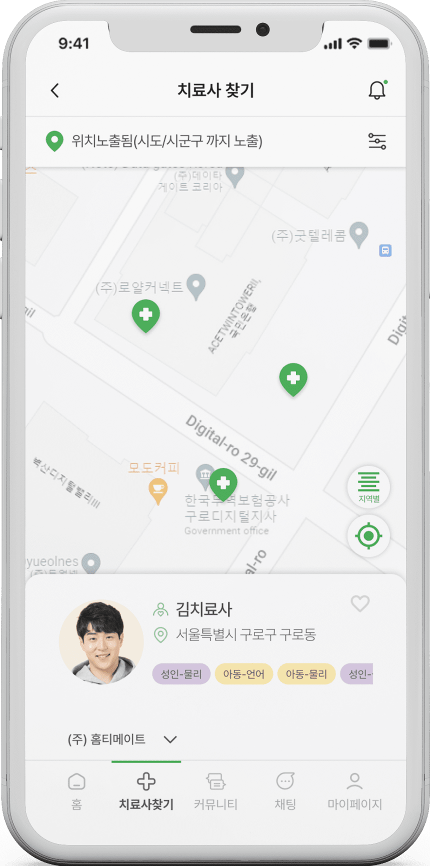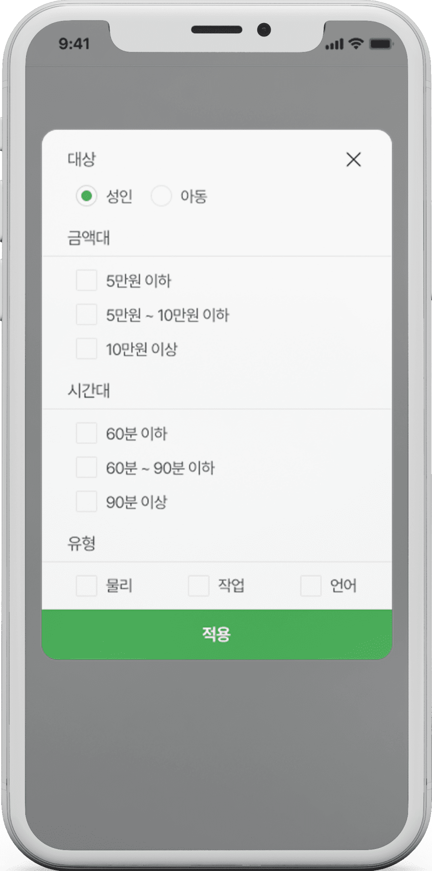 필터링을 통해 조건에 맞는 치료사 프로필을 확인 후 선택할 수 있어요.