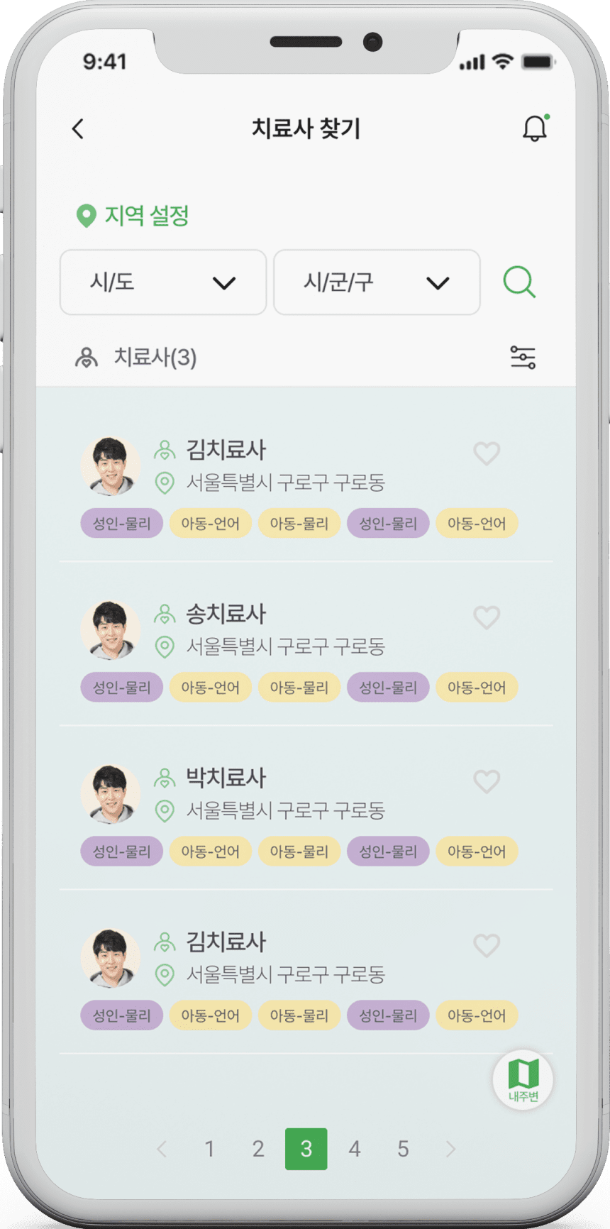 필터링을 통해 조건에 맞는 치료사 프로필을 확인 후